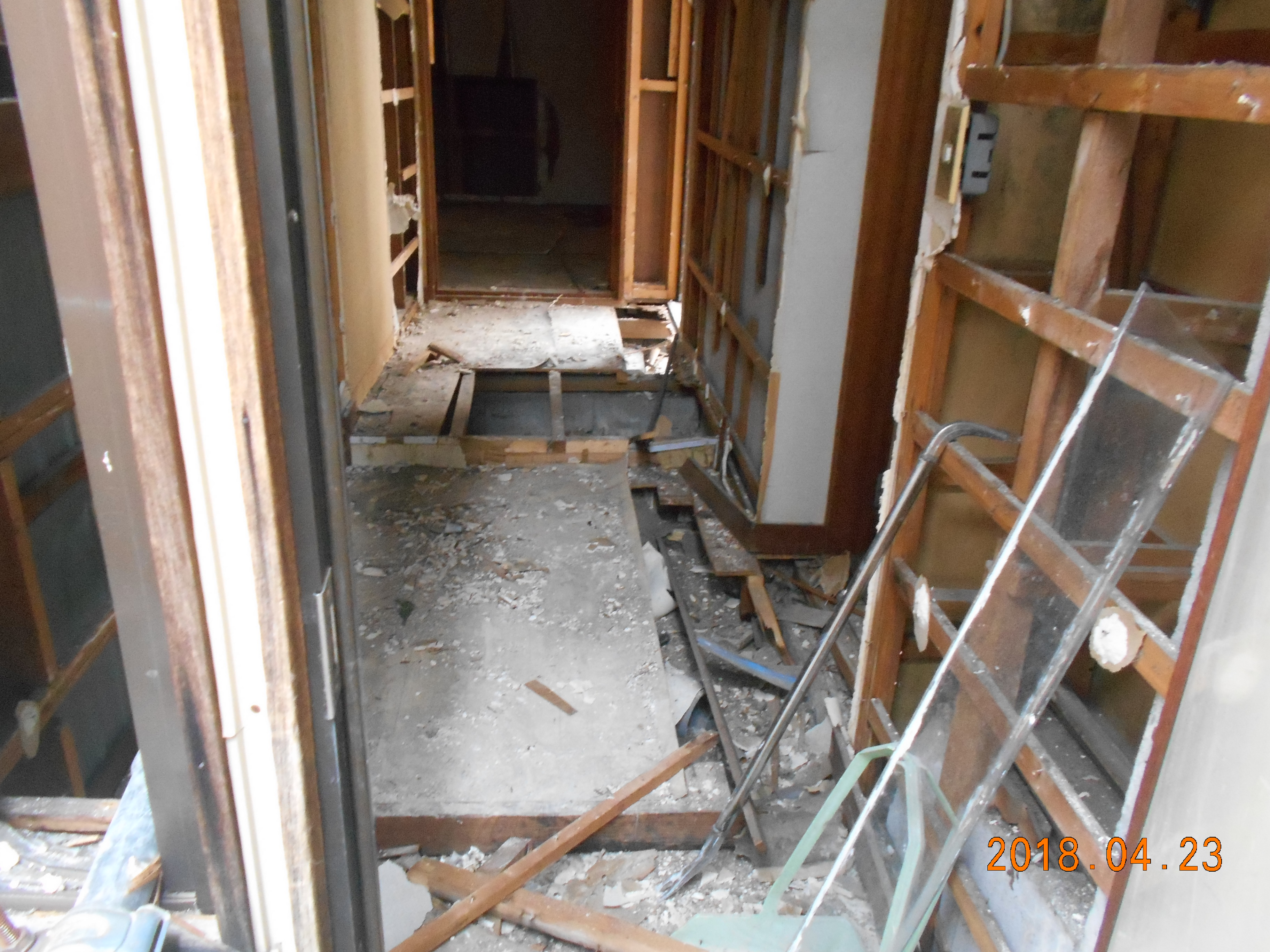 屋上小屋解体工事:仮設足場架け払い、防災シート、解体:屋上木造解体、木造部積込、搬出、屋上鉄骨部積込、搬出、屋根一部切り離し、残材処分