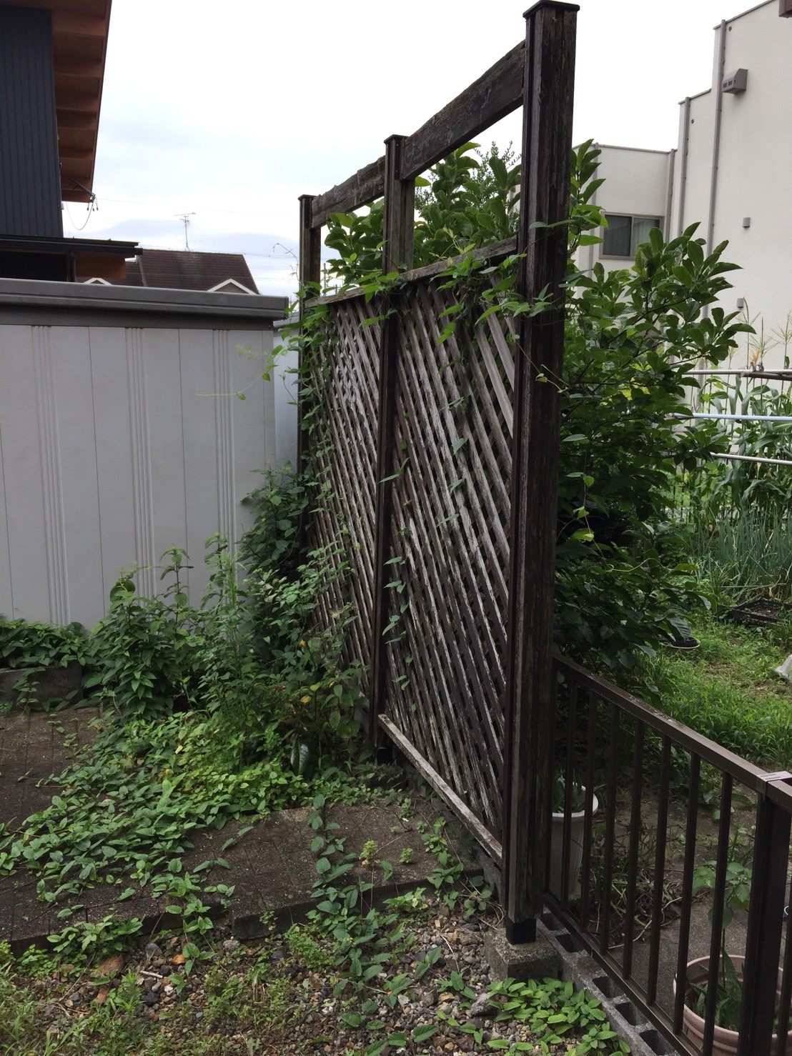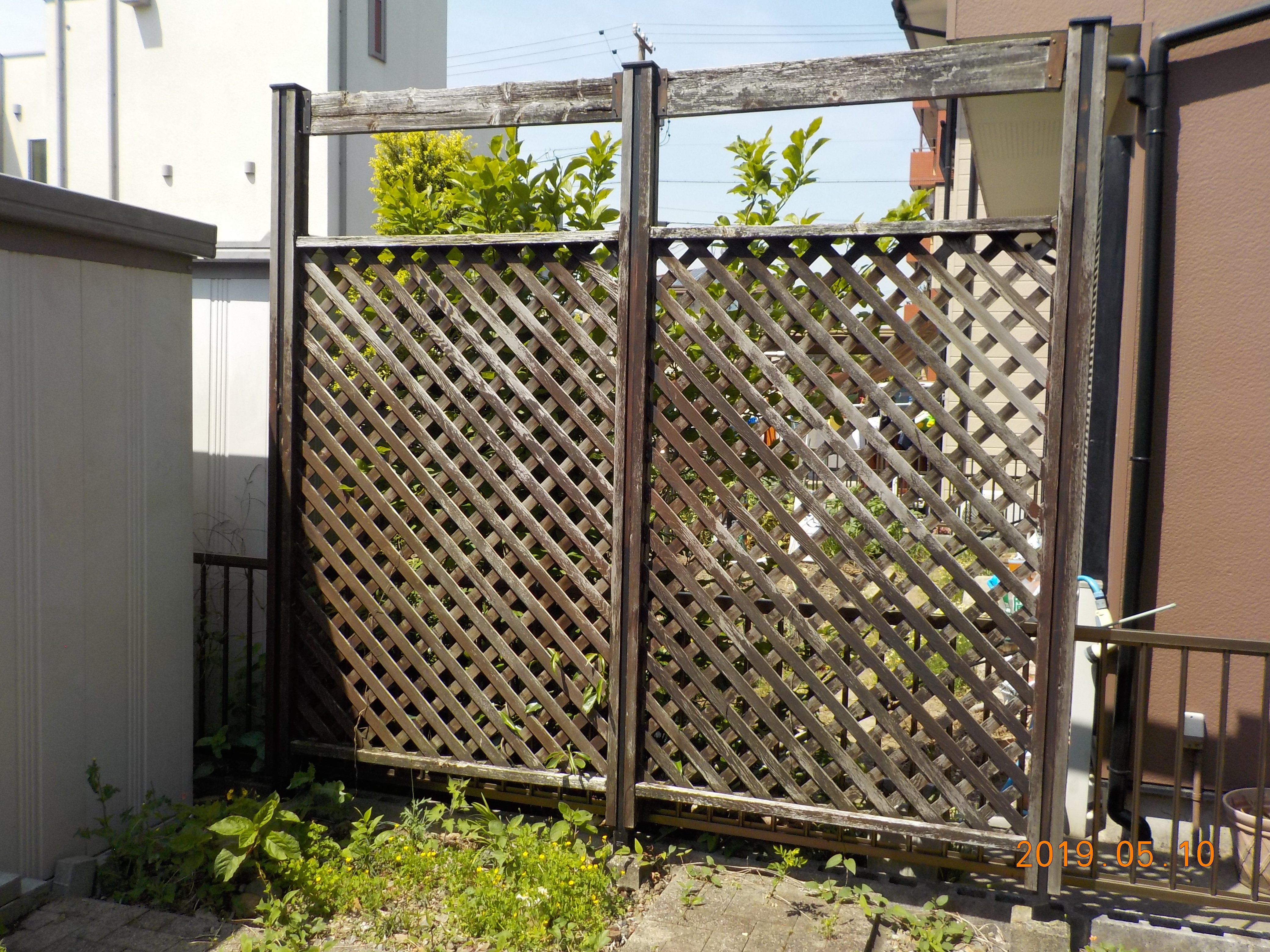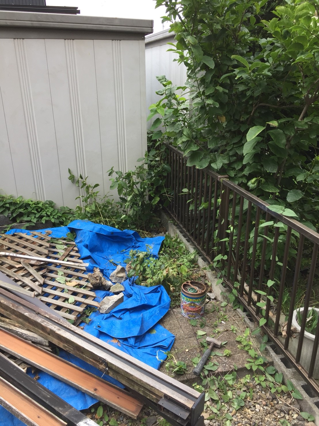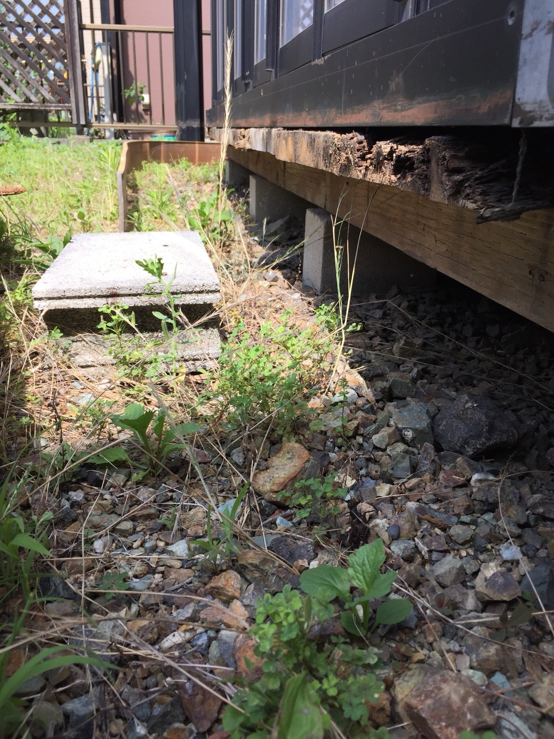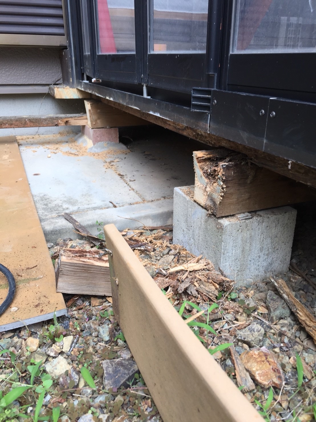 サンルーム部分補修・その他工事:大工;大引き・垂木材受け補強、間隠し撤去:目隠し撤去・処分、ブロック基礎;サンルーム廻りシロアリ防除工事:被害は見当たらないとのこと