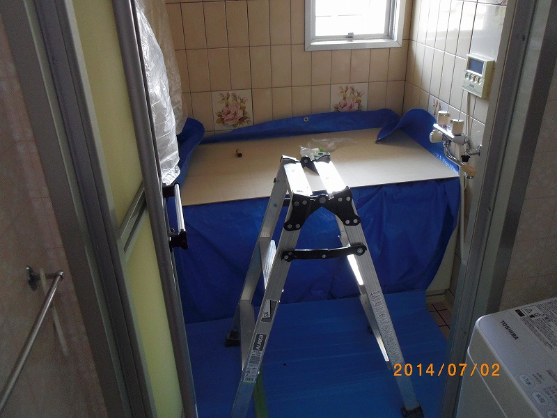 浴室工事 解体:テラス壁面屋根一部解体・外壁、浴室 解体撤去処分 基礎:増築部ブロック基礎【1.9メートル】 土間:ユニットバス下地土間コン打設【2.9平方メートル】 木:材料(土台、桁、柱、間柱、銅縁等)内装材(枠・PB・幅木・廻縁等) 大工手間(釘金物刻み含む) クロス:脱衣所壁紙貼り 水道:埋説配管やり変え 温水器移設及び配管工事 電気:温水器及び浴室配線工事 サッシ:面格子付引き違い窓ペアガラス【W=1620 H=700】 テラス西面ドア(Wカット加工) 外壁サイディグ貼り 外壁サイディング塗装 テラス:壁面屋根加工復旧アルミ躯体共 システムバス工事:LIXIL システムバス キレイユ1616 LBE RL 壁付けサーモ水栓追炊き穴加工 組付け施工費