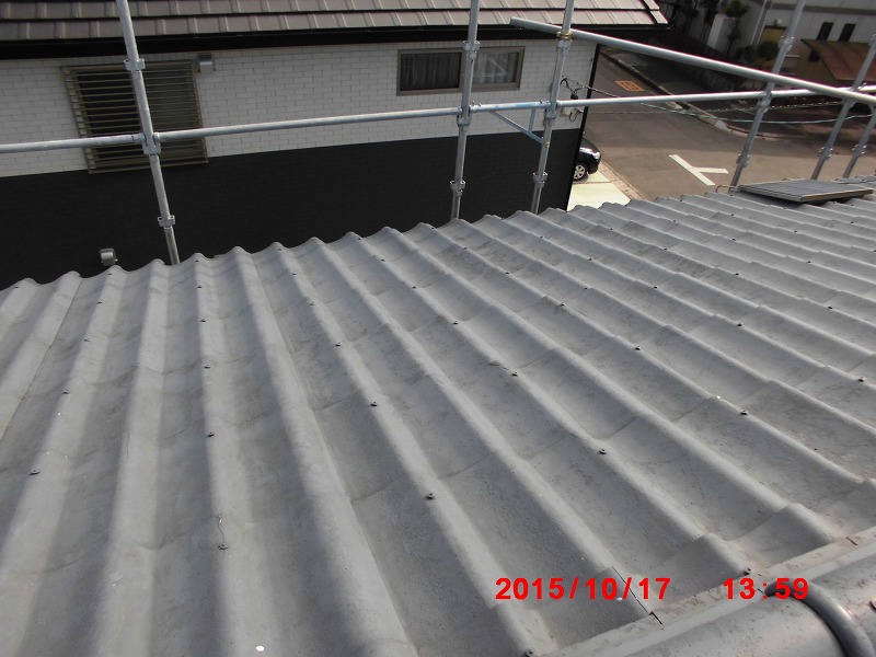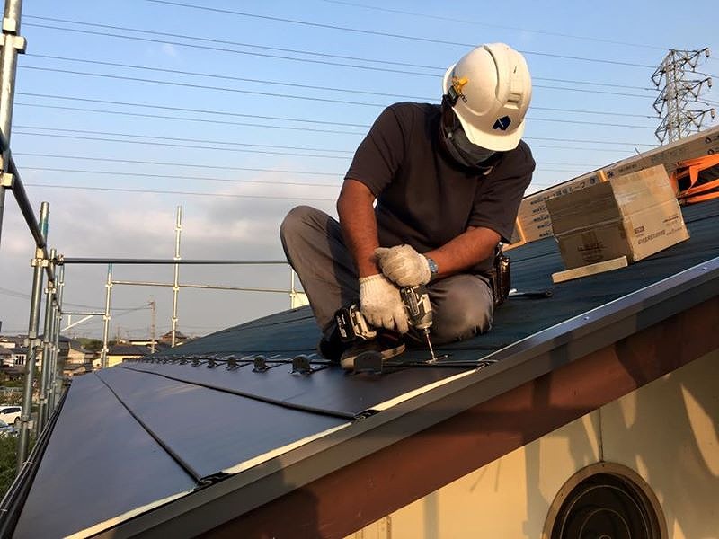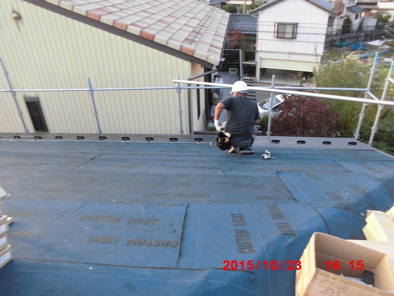 屋根板金カバー工事:仮設足場架け払い【260.0平方メートル】 屋根:既設屋根かわらUめくり撤去処分【96.6平方メートル】 粘着ルーフィング【96.6平方メートル】横暖ルーフきわみ【96.6平方メートル】棟(下地込み)【23.8メートル】 唐草 軒先、ケラバ共【43.0メートル】 壁際水切り【1.5メートル】 雪止め@450【850ヶ所】 雨樋:既設軒樋撤去処分【37.0メートル】 既設たて樋撤去処分【28.5メートル】 軒樋パナソニックPC50(金具込み)【37.0メートル】 たて樋60(金具込み)【28.5メートル】 集水器【5個】