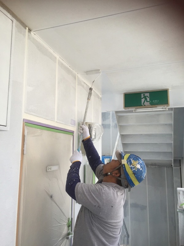 外壁塗装工事:仮設足場架け払い・シート養生【686平方メートル】 外壁:高圧洗浄【659.2平方メートル】下塗りフィラー・中塗りシリコン・上塗りシリコン【611.2平方メートル】 軒天アクリル塗装【140.4平方メートル】 軒樋ウレタン2回塗り【21.4メートル】 縦樋ウレタン2回塗り【98.5メートル】 コーキング爆裂補修エポキシモルタル樹脂【2ヶ所】 コーキング(窓廻り・継部・増し打ち)【993.6メートル】 屋根:高圧洗浄(外壁共)・下塗りシーラー・中塗りシリコン・上塗りシリコン【48平方メートル】 他:笠木・ケレン・サビ止め・ウレタン【88メートル】 鉄扉枠・ケレンサビ止め・ウレタン【15ヶ所】 蛍光灯カバー電気BOX【1式】 階段鉄骨ケレン・サビ止め・ウレタン【50.1平方メートル】 階段手摺ケレン・サビ止め・ウレタン【8.8メートル】 階段足場・脚立足場【1式】