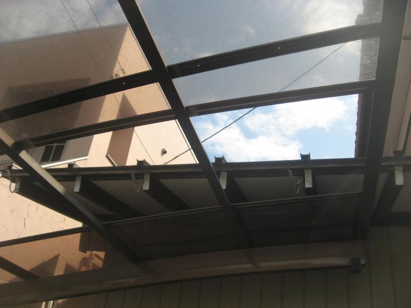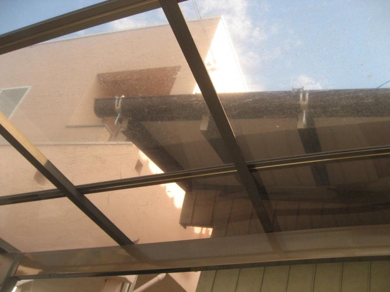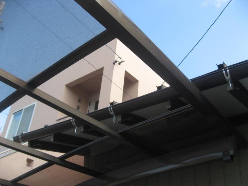 下屋根雨樋架け替え工事 既設軒樋、撤去、処分【40.0m】 既設よび樋撤去・処分【3.0m】 軒樋 半丸105 【40.0m】 呼び樋【4.0m】 集水器【4個】 ポリカ屋根脱着【1式】